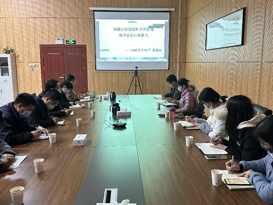 本次培训系统学习了二十大报告中依法治国和法治建设内容和《国务院办公厅关于全面推行行政规范性文件合法性审核机制的指导意见》《河南省行政规范性文件管理办法》《河南省人民政府法制办公室关于认定行政规范性文件的指导意见》等文件。培训结束后,与会同志结合在对行政规范性文件进行合法性审核工作中发现的问题做了沟通交流。